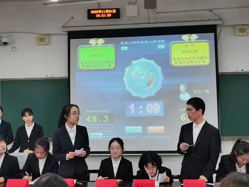 对辩环节,正方二辩强调“戏说不等于胡说”而反方二辩机智驳论,认为当今出现了古偶盛行、朝代大乱炖的不良现象,影视剧的娱乐性只能带来短期的经济利益而忽视了长久的价值追求,并以《王的女人》《康熙王朝》为例,指出戏说历史的种种弊端。双方激烈交锋,口若悬河,流利的接制与巧妙的提问令各位评委和现场观众赞叹不绝。