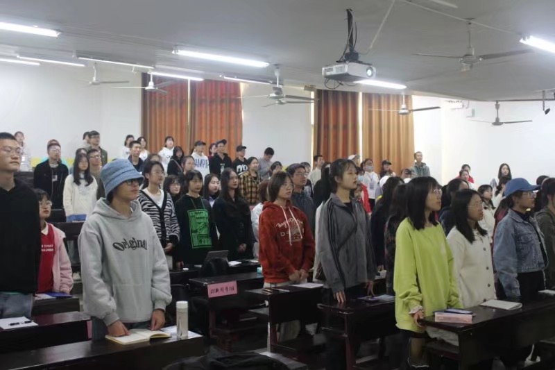 课程伊始,主持人进行开场致辞。团课第一项由学生会组织部干事李祎迪讲授中国共产主义青年团的基本知识。李祎迪同学从共青团的重要性出发,从历史沿革、组织原则和基本任务、入团条件及团的特征四个角度细致讲授关于共青团的基本知识。同学们聚精会神,深刻体悟了共青团发展的悠久历史,感悟到了数十年风雨飘摇间共青团的凝聚力。通过对共青团基本知识的立体化了解,同学们收获良多,社会责任感与历史使命感涌上心头。在李祎迪同学的带领下,同学们齐唱共青团团歌,铿镪顿挫。