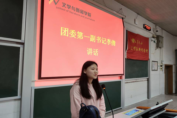 团课一开始,李倩分别提出了“净、进、竞、镜、静”五个字,分别代表“净化”、“进取”、“竞争”、“镜子”和“宁静”这五个词语,指的是当代大学生要净化自己的思想,积极进取,有良好的竞争意识,也要时常懂得审视自身的不足,保持一种宁静的心态,不骄不躁。李倩结合了自身的经历来解释这些词对青年一代品质的要求,以此来勉励各位同学。演讲之后,台下响起了一片热烈的掌声。