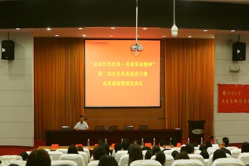 第二届“品读红色经典,传承革命精神”红色经典阅读大赛成果展演暨颁奖典礼在逸夫楼一报告厅隆重举行。副校长刘建平,党委组织部、党委宣传部、学生工作部(处)、校团委、子弟学校等单位负责人及男同网