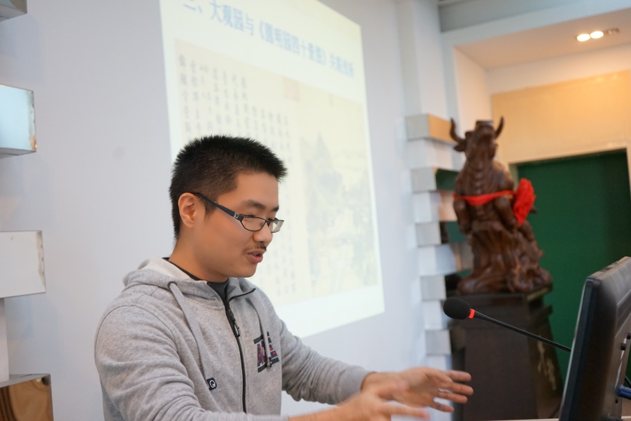 奚沛翀同学从这种关系浅探的可能性、现存《圆明园四十景图》与大观园布局之比较、二者产生时间对比及各自作者的社会关系梳理研究讲起,其激情洋溢、深入浅出的讲解以及对《红楼梦》溢于言表的热爱都使得同学们为之深深折服。在提问环节中,奚沛翀同学针对如何写论文、如何看待目前多用西方文学理论知识研究中国文学的研究现状作出了自己的解答:在学习及论文写作这方面,首要的是找到自己的兴趣点,然后针对这个兴趣点完成知识储备工作,广泛学习,深入探究,此外还要多练笔多投稿,多练习就会有所收获。对于第二个问题,奚沛翀同学认为,我们目前能做的还只能是多学习,将理论知识融入自己的知识体系中,将西方文论知识与中国理论结合起来,才能更好的进行文学研究。