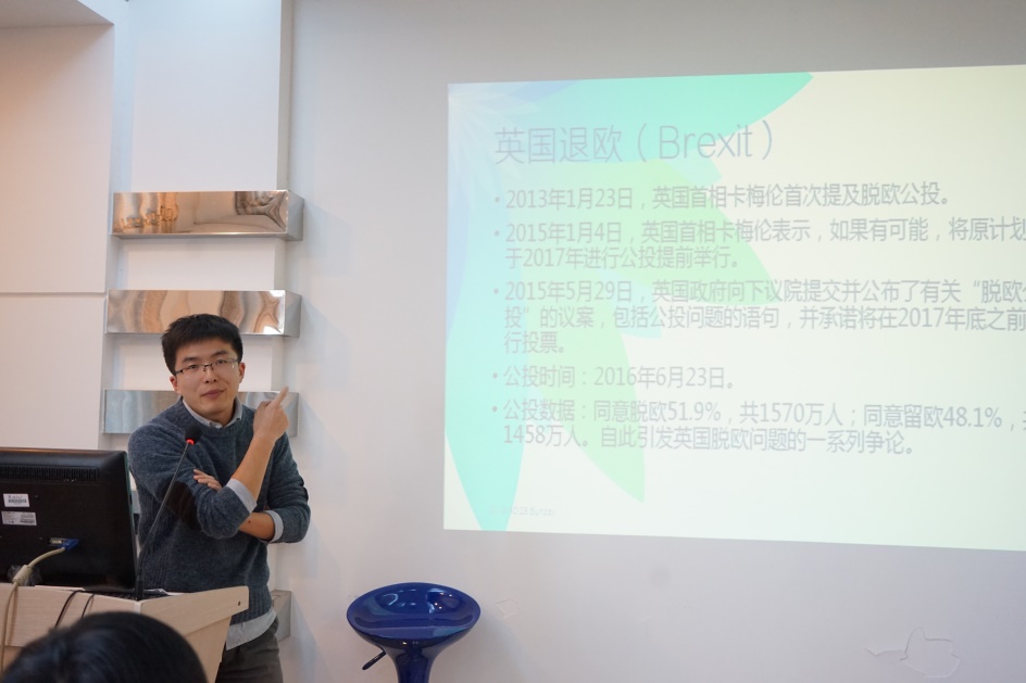第三位主讲人是法学院2017级国际法博士研究生焦园博同学,他以最近美国大量退出各个国际协定的事件引出前几年一个震惊世界的事件——英国脱欧事件,并从国际法角度分析英国脱欧的可能性、以及英国脱欧会对欧洲、对世界产生何种影响。焦园博同学为人幽默风趣,语言生动活泼,演讲时,对社会时事、国际协定也如数家珍、信手拈来,分析鞭辟入里,赢得了同学们的掌声。在提问环节中,焦园博博士对同学们提出的问题做了细致的回答,并对欧盟的未来做了一个简短的评价。