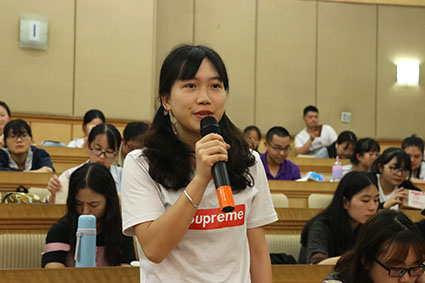 最后是交流探讨环节,现场气氛活跃,同学们对嘉宾老师提出了六个问题。针对 “作为新时代的大学生,应该怎样做才能稳步迈过思想关”和“如何看待如今中国‘不畏事’的坚决态度”等问题,刘穏丰老师指出“你光明,中国便不黑暗”,思想是行动的先导,要树立正确的世界观人生观价值观,贯彻学习党的十九大精神,提高自身精神境界。赵猛老师认为:要坚持和平共处五项原则,互相尊重领土主权、互不侵犯、互不干涉内政、平等互惠、和平共处。何妍老师也补充说明‘不畏事’的背后是综合国力的提升,激励当代青年人要努力担当时代的重任。潘信林老师更是鼓励同学们积极投身实践、进行研究,用知识振兴乡村,服务国家。在师生共同交流探讨的热烈氛围中,现场有同学表示:这有利于自己消化吸收红色经典的内容,进一步将红色文化内化于心、外化于行。