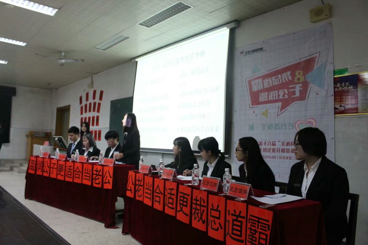 陌上花开人无双,皓若明月,温润如玉的公子总是令觉美好;鲜衣怒马纵少年,剑眉星目,指点四方的霸主总是引人追随。温润公子和霸道总裁都是言情戏中最为常见的男主角,那究竟哪个更适合担任人生伴侣这一重要角色呢?本次辩论赛表演赛就此便展开了激烈的讨论。正方认为“温润公子”更适合担任人生伴侣,反方则认为“霸道总裁”是人生伴侣的不二人选。辩论赛开场,双方辩手互相致意并问候了在场观众。正方一辩为文新院优秀辩手要呈阳,二辩为文新院优秀辩手潘婧晨,三辩为文新院辩论队副队长谢可悦,四辩由文新院优秀辩手李金城担任。反方一辩为文新院优秀辩手闫雨昕,二辩为文新院辩论队队长李红萌,三辩为文新院辩论队领队周晓雪,四辩由文新院优秀辩手吕昕蒙担任。