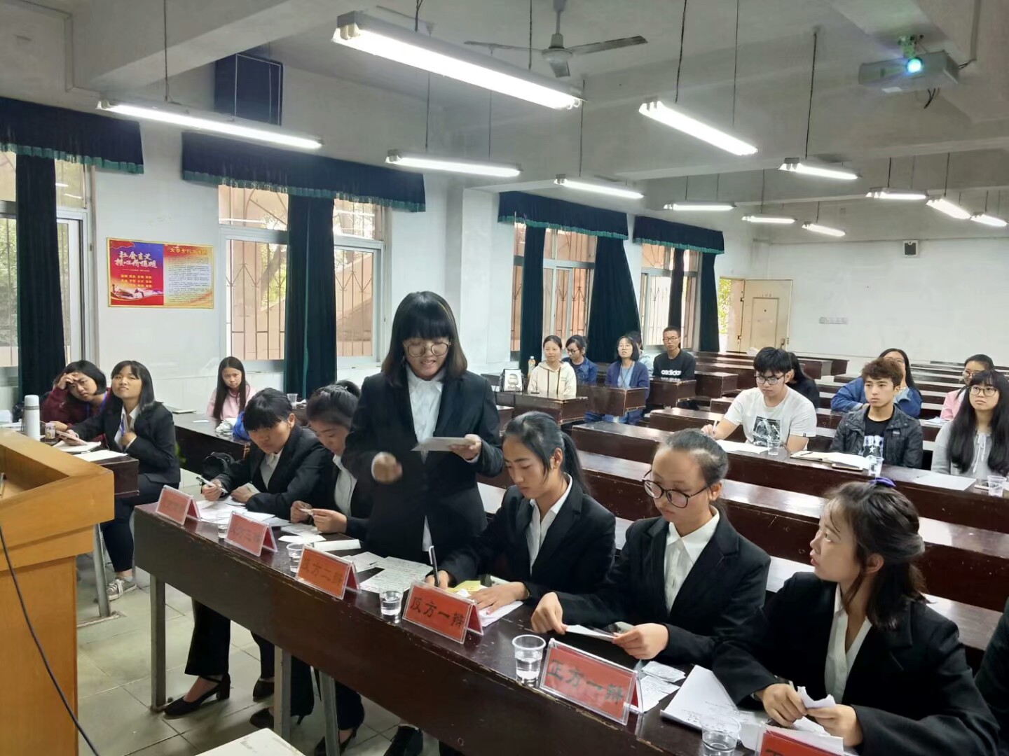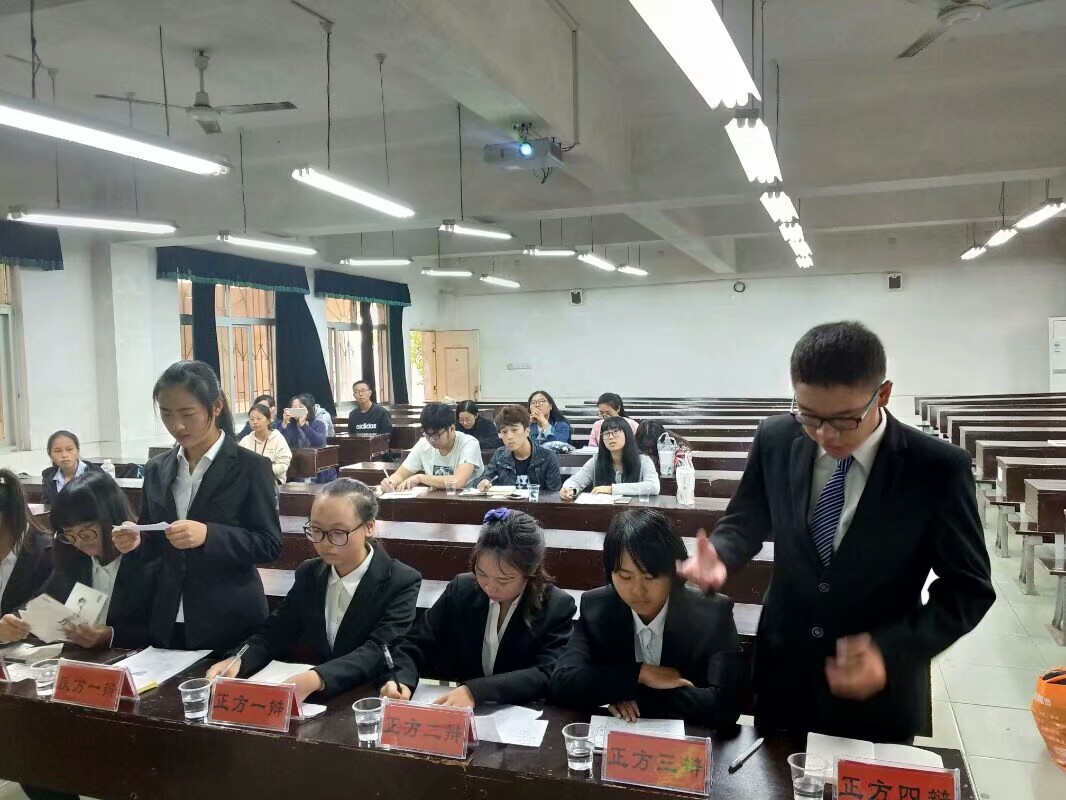 本场辩论赛的辩题为‘人懂的坚持更重要还是人懂的退让更重要’。在赛前,两班进行了抽签,新传二班抽中正方论题认为‘人懂的坚持更重要’,而新传三班则抽中反方论题认为‘人懂的退让更重要’。双方实力伯仲之间,又经过大量的准备和训练,比赛的精彩程度可想而知。本场比赛,正方新传二班派出的选手为一辩欧芊利,二辩肖美琪,三辩陈萌蕾,四辩金宸亦;反方新传三班则派出了一辩曽子懿,二辩赵东宇,三辩白薇,四辩王琦。