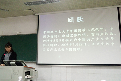组织部副部长孙惠进行团课讲解。孙惠副部长介绍了入党流程及团的基本知识,包括团旗、团徽、团员证、基本理论、基本任务、团员义务等,并介绍和播放了团歌《光荣啊,中国共青团》。在气势滂沱的团歌声中,在孙惠副部长清晰明了的介绍中,到场同学对中国共青团有了更加深入的了解与认识,同时也更加为自己身为一个共青团员而感到骄傲。