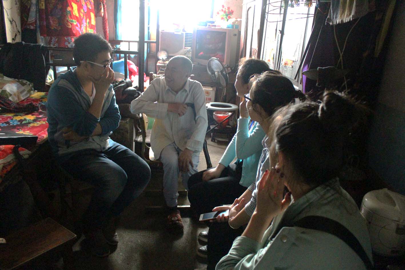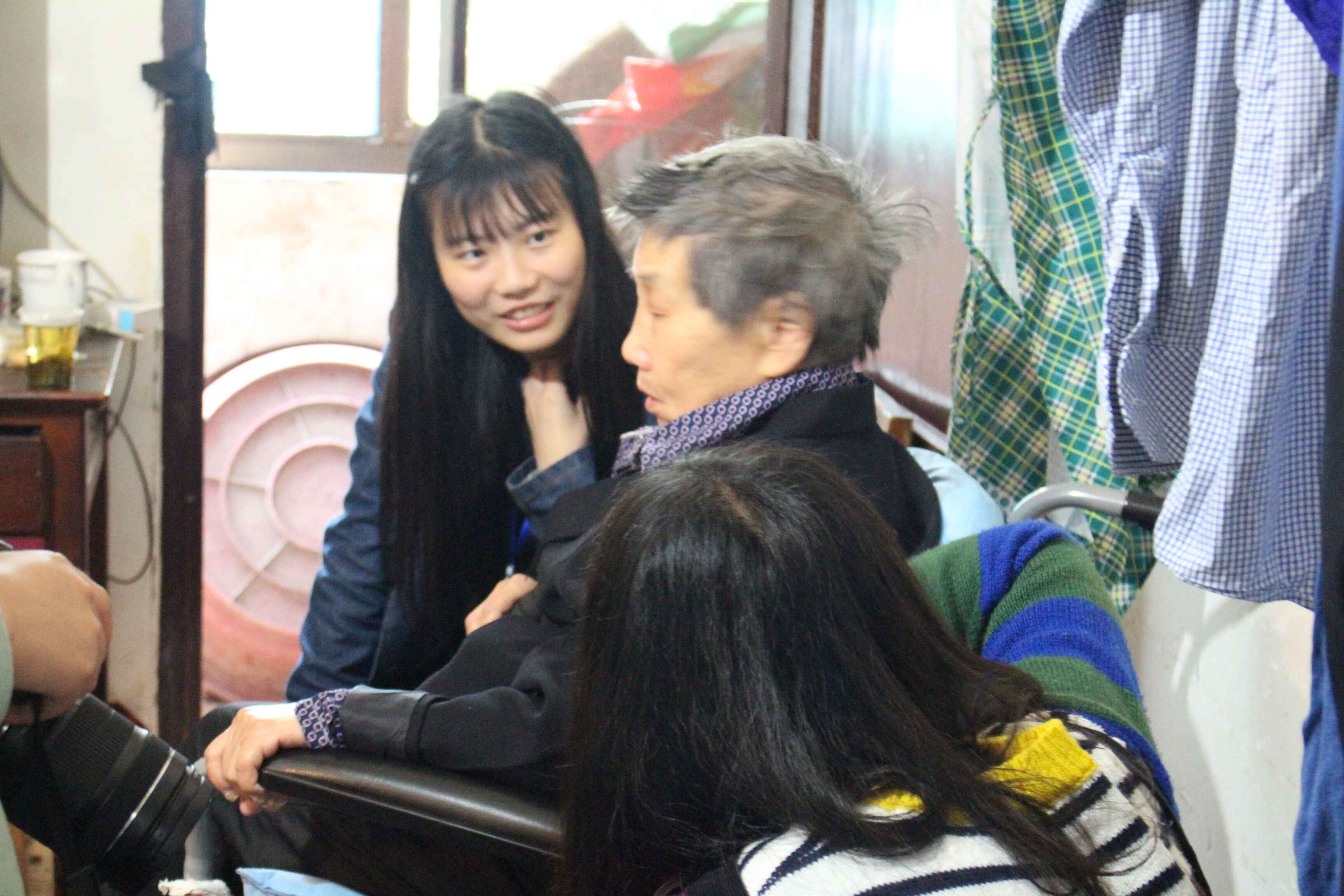 志愿者们照例被分好小组,第一组志愿者首先来到一位爷爷家,我们敲门进去的时候,爷爷奶奶正在看电视,房间里光线很暗,电视机里传来戏曲的声音。见大家进来,奶奶忙扶着爷爷从床上下来,招呼大家坐下。这不是志愿者们第一次前来看望,所以爷爷奶奶见到这些熟悉的年轻面孔时,露出了欣喜的笑容。爷爷年纪大了,患有心脏病、糖尿病、高血脂,各种病痛缠身,因而行动起来并不方便,但他还是笑着招待大家。不一会儿,爷爷就打开了话匣,他谈及自己的日常饮食、身体状况,还谈到自己的老朋友们。爷爷说的是方言,有时候志愿者们听不懂,还会互相做翻译,大家聊得十分开心,笑声连连。奶奶则一直在旁静静地看着老伴儿。平时,他们出门并不方便,有时也会有些许孤独。但今天有这样一群年轻人陪着爷爷奶奶聊聊天,也给平淡的生活增添了一丝光彩。