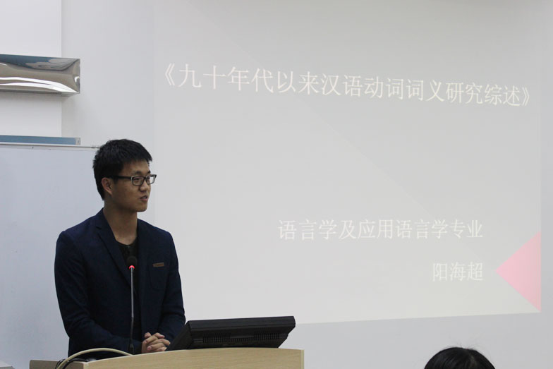 来自语言学的阳海超演讲的主题是《90年代以来汉语动词词义研究综述》,在对大量的研究资料的整理之下,从宏观角度总结汉语动词词义的研究现状。通过对具体某个动词的研究、对某类动词的研究、对专书的研究、对汉语与其他语动词的研究,总结出现有短语动词研究的成果和经验,同时也看出现有研究所具有缺陷与不足。