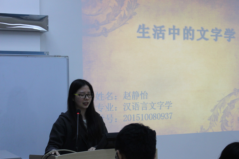 最后一位精彩的学术演讲由来自汉语言文字学的赵静怡带来。她通过列举生活中平常可见、生动有趣的例子来讲述《生活中的文字学》。在演讲的一开始,她便以自己的名字为例,借助《说文解字》对字的解析,讲解名字背后的含义。之后又通过对“堂”、“室”等字的分析,表明生活中只要你细心观察、勤于考证,每一个文字都有它的特殊含义,文字学在生活中是无处不在的。