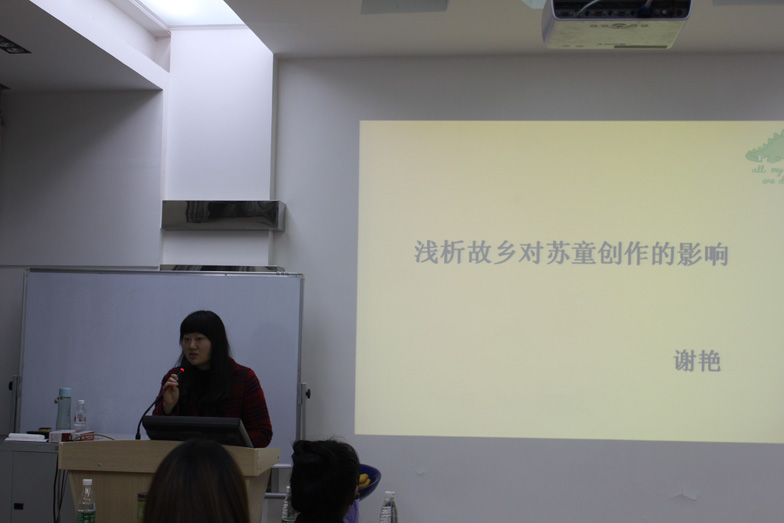 接下来上场的同样是来自文艺学的谢艳,她从苏童的作品《米》谈起,分析作者从小生活的故乡——苏州对于他创作所带来的影响。苏州作为苏童所生活的“根”,这个地方带给了他许多潜移默化的影响,故乡情结、南方文化的传统影响到了作品的人物塑造、苏州人的性格影响到了作品的创作风格。也正是因为如此,在苏童的每一部作品中,都呈现的是一幅惬意悠扬的江南水乡的模样。