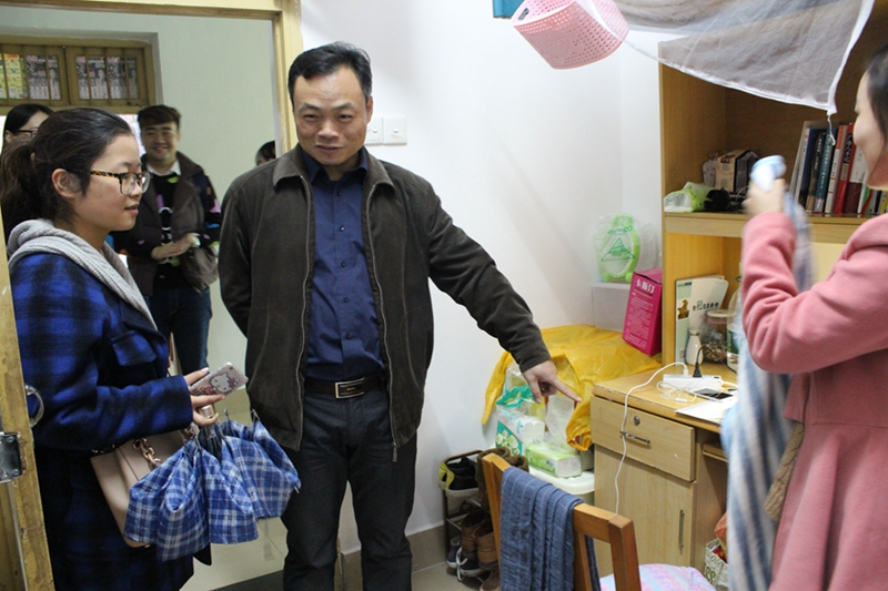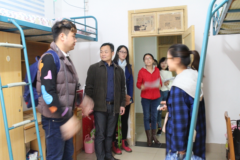 学生所在1、11栋宿舍楼。在学生寝室里,老师们与学生亲切地交谈,了解寝室卫生打扫及检查情况,督促学生积极保持寝室卫生。同学们寝室内物品摆放较为整齐,地面干净整洁,寝室内装扮温馨舒适,良好的卫生状况得到领导的一致赞赏。每到一处,领导都仔细查看寝室的各个角落,特别提醒大家注意冬季用电安全和卫生死角的清洁。