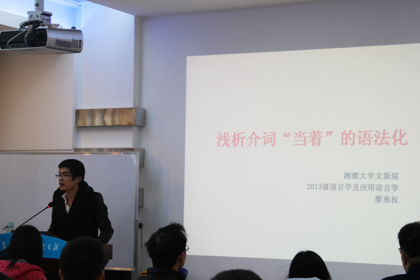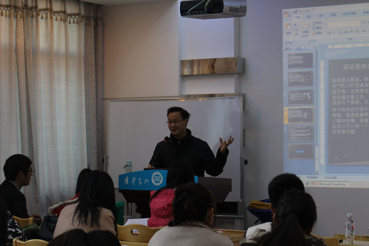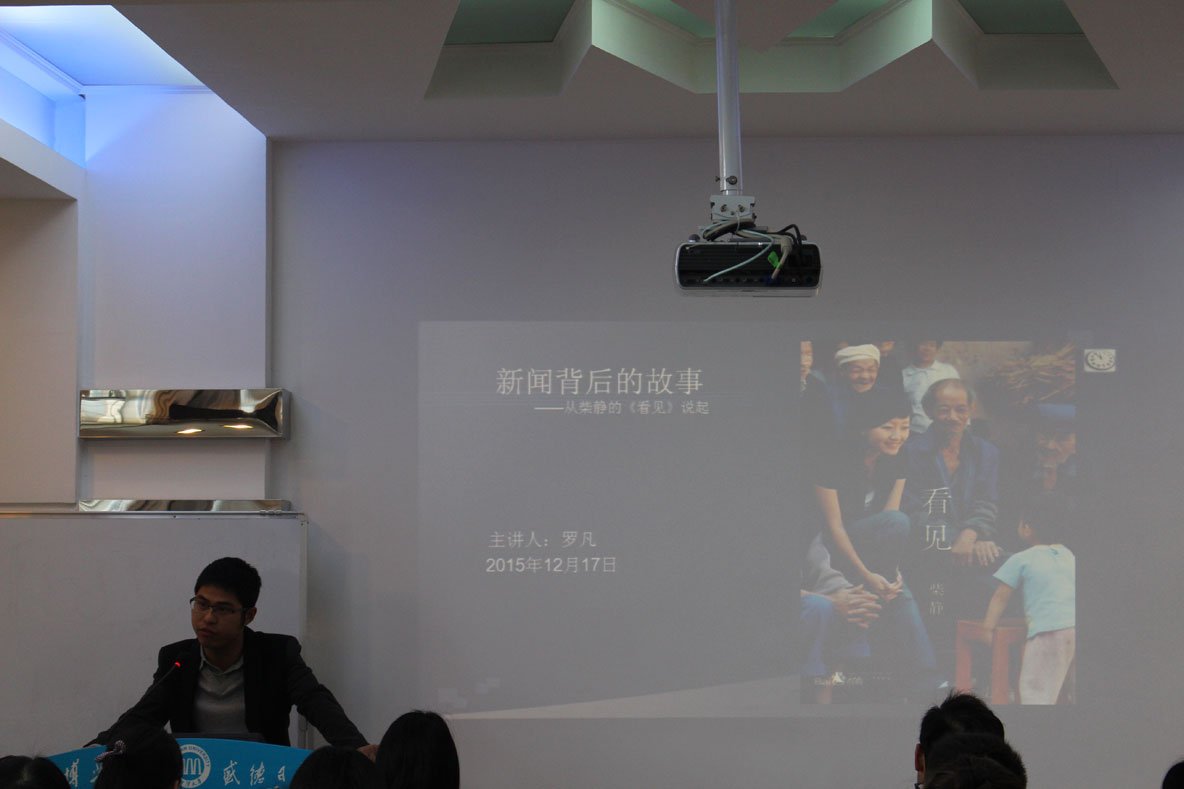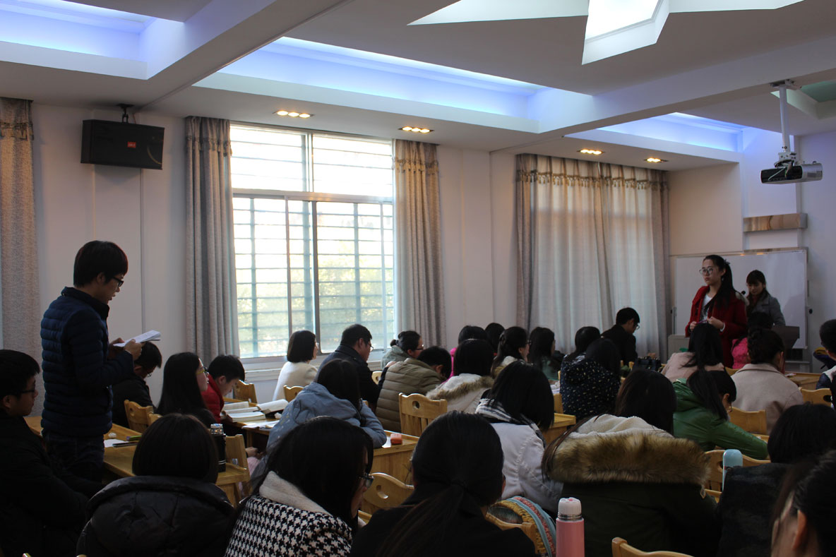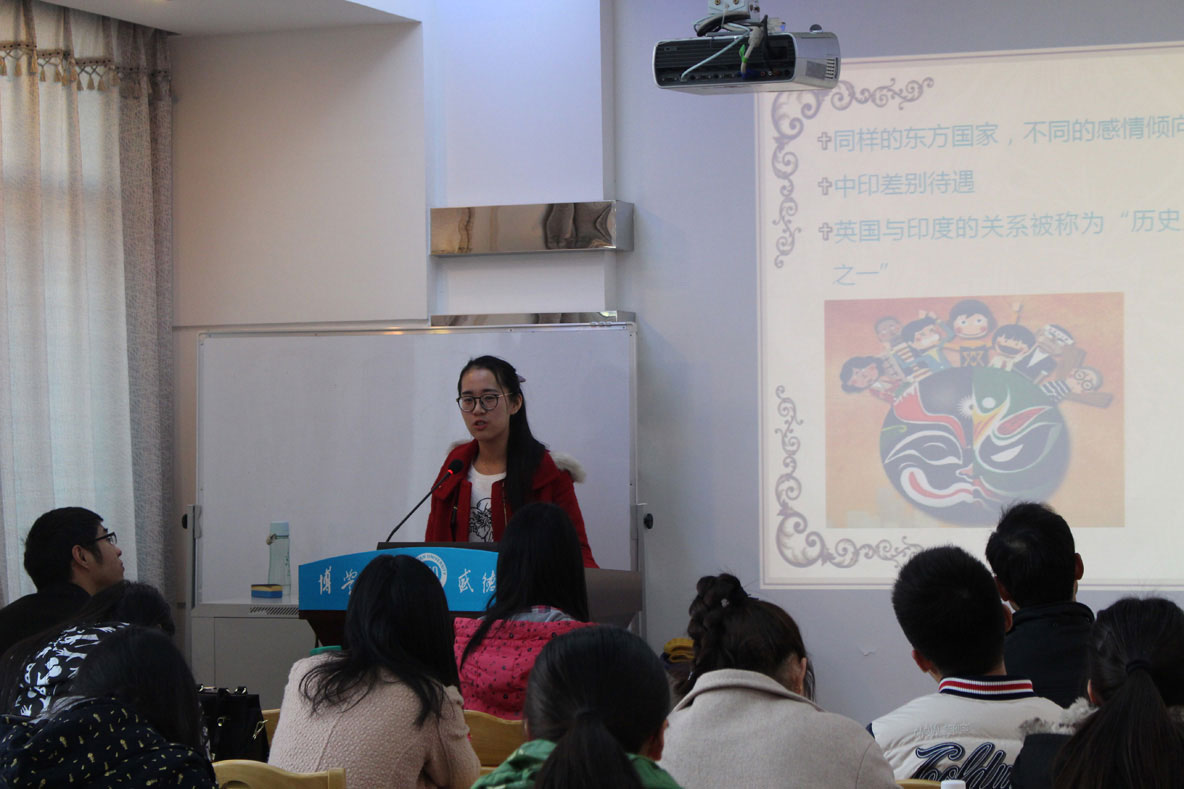 来自13级语言学的黎勇权率先发言,以“浅析‘当着’的语法化”为题,运用语言学的知识来探讨“当着”的语法化及其演变机制、“虚化”历程、带宾语情况。通过对语料的耙疏,从历时层面和共时的层面看到“当着”动词性的用法生命力。法学院的罗凡则把中文、新闻、法律结合到一起,从柴静的《看见》说起,探讨新闻背后的故事。通过对《看见》中的新闻故事分析阐述,给出关于新闻自己的看法,并认为新闻与法律是共通的,都需要多角度的观察,尽可能保证其客观性,关注事实真相。来自15级比较文学的赵梦雅所论述的是《刀锋》中的印度形象,其从毛姆塑造印度形象的缘由开始,讲述毛姆笔下一个与过去西方世界所认识的完全不一样的印度。这种对印度“神秘”的描写、对“艳情”的正名,是东西方之间一种有意义的跨文化尝试。三位主讲人的演讲引起了大家的浓厚兴趣和广泛提问,现场气氛活跃。符继成老师评价此次三位同学的演讲对我们每一个人的学术研究都是有极大的启发的,学术研究不仅仅是要在文学上而且是要在文化层面上,我们要多多注意文化与文学之间的联姻,把握学术研究的深度。