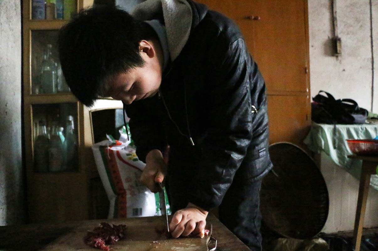志愿者在切肉片