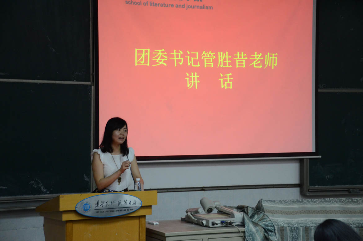 文学与新闻学院第十四届团委学生会述职大会暨年度总结表彰大会暨第十五届团委学生会受聘大会在经管四阶准时召开。本次大会的嘉宾有党委唐春副书记和团委书记管胜昔老师。大会由主席助理管君琳主持。