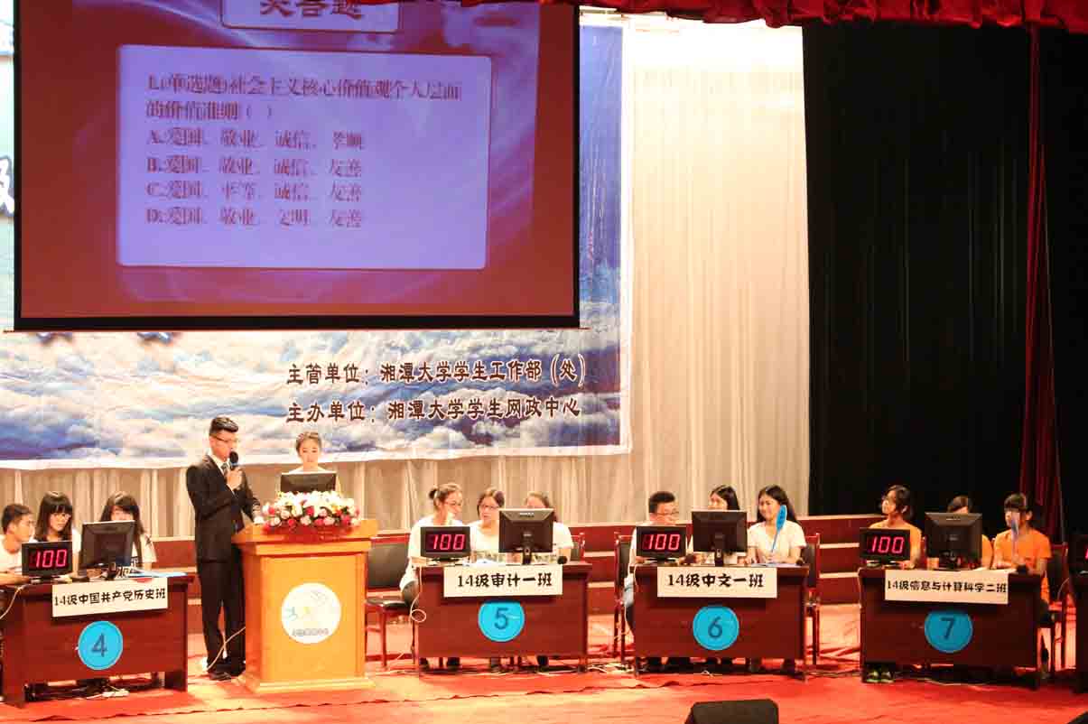 参赛班级中文一班沉着冷静,机智应答,最终得分为140分,同最高分14级行政管理二班相差三十分。第二轮比赛为“抢占先机(抢答题)”。14级中国共产党历史班在本轮中表现抢眼,多次获得抢答权,和14级人力资源管理二班共同夺得本轮最高分180。男同网