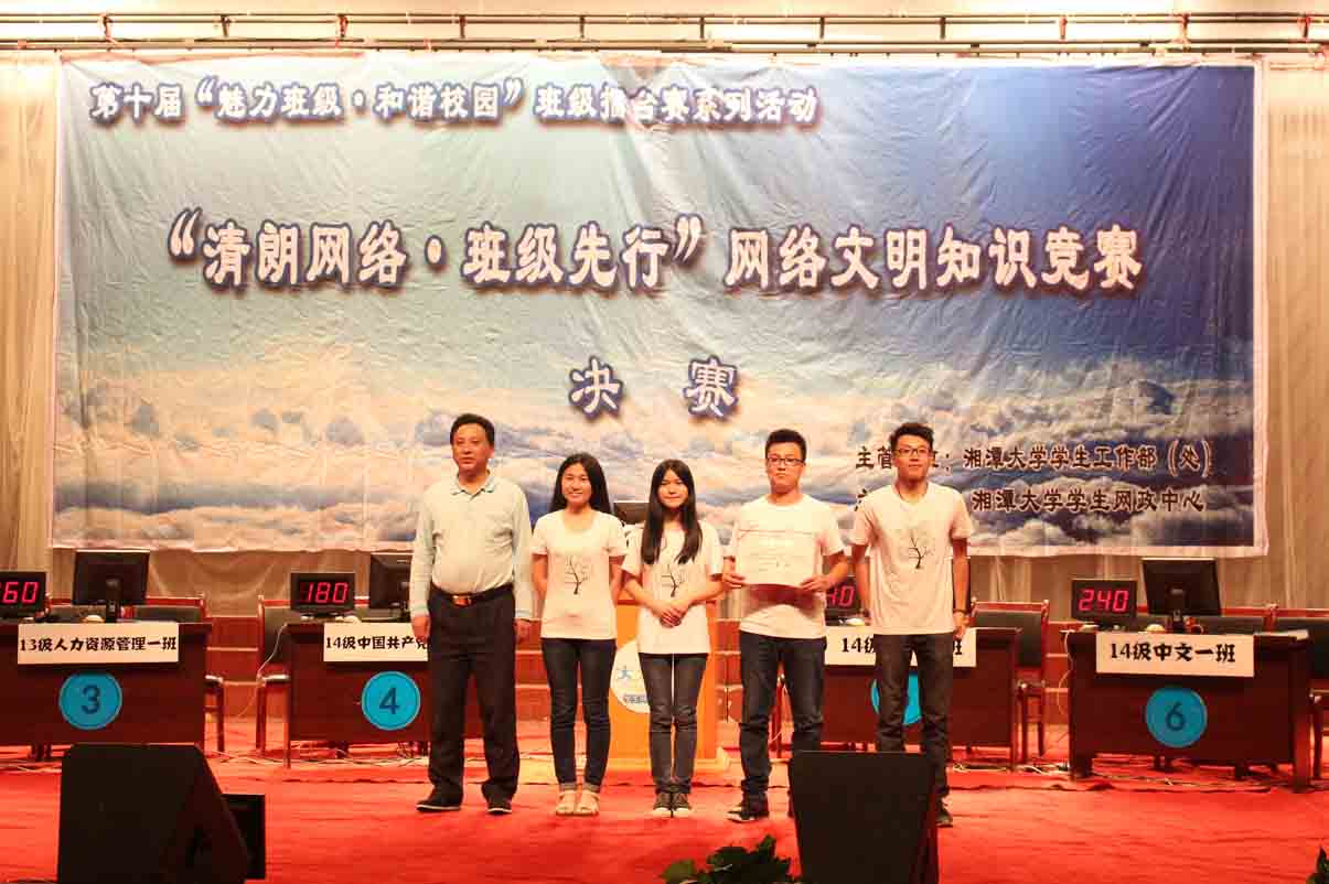 比赛结束,主持人宣布“清朗网络·班级先行”网络文明知识竞赛获奖名单:14级汉语言文学一班获一等奖,14级历史学班和14级审计一班获二等奖,14级人力资源管理二班、14级中国共产党历史班和14级行政管理二班获三等奖。