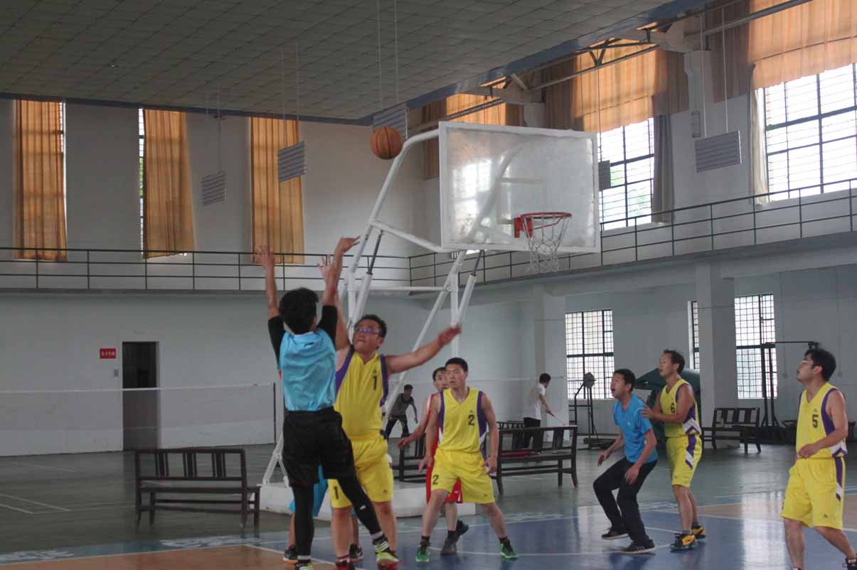 中午十一时三十分,比赛正式开始。首节比赛双方你来我往,攻防演绎,令人窒息。教师队在素有“湘潭科比”称号的宋德发教授的掌控下牢牢掌握比赛节奏,而被学生戏称为“文新天勾”的周建军教授则屡屡上演高难度的勾手进球好戏,引得一片欢呼。学生队也在前院队队长王登学和程光鑫的率领下多次打出快速的反击。但由于体力不支,学生队在第二节联防多次漏人,连续被教师队打出高质量的转换进攻。最终上半场比赛结束,教师队以54:40的比分领先。