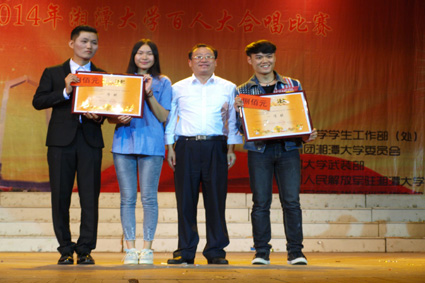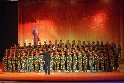 百人大合唱比赛在我校俱乐部隆重举行。出席本次活动的评委有:湖南省优秀男高音歌唱家周丰庆先生、湘潭市舞蹈家协会理事长田海望老师、广东军区驻湖南高校培训办干事范涛中校、男同网