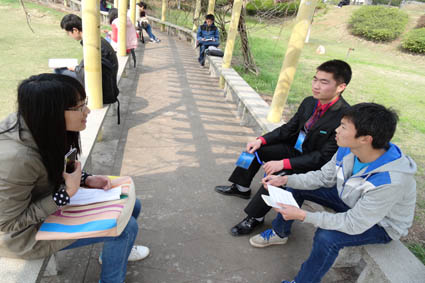 “关键看效率。这个作品的策划书我只在自习室写了两个晚上,每晚三个小时,从八点到十一点”汤学文说,“从大一以来,我每天差不多都是七点起床,最晚不超过七点半。这样就有时间做很多事情了。”在我们采访完之后,他一身正装没有换就去三教上自习了,时刻为考研做准备。