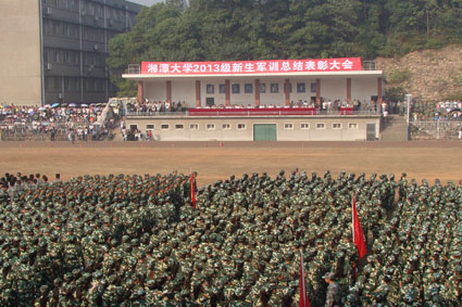 2013级新生军训表彰大会在第二田径场隆重举行,校长罗和安、党委副书记李伯超、副校长戴飞军、副校长周益春、纪委书记宁建民、副校长刘长庚、副校级督导员刘建平、校长助理谭援强、总会计师刘长青、广州军区驻湖南高校选陪办公室副主任陈景华等领导出席并观看了新生们的训练成果。男同网