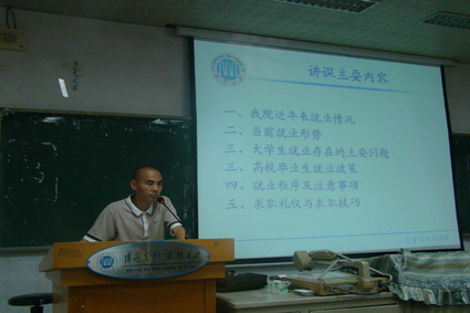 本次活动旨在帮助2010级即将毕业的大四学生确定就业方向,尽快地让他们在思想上、行动上早做准备,指导毕业生走好从大学走向社会的重要一步。唐老师用生动的语言、鲜明的事例,围绕大学生就业形势进行深入分析和详细讲解,指出了大学生就业存在的主要问题,切合实际向学子们提出了一些要求。特别强调毕业生在踏上了工作岗位之后,要怀有一种虚心的工作态度,对待工作要踏实肯干、执着追求。在面对就业问题时,毕业生在积极准备,拟定职业规划,避免走入就业观念误区。
