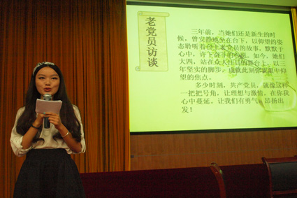 随后,活动进入核心环节——优秀党员访谈。来自中文、新闻、广告和广电四个不同专业的优秀学生党员胡佩、沈照宇、黄安琪和侯丽梅,与在场学生就学习、社团活动、实习及入党方面分享自己的经验与心得。针对大学四年对自己最大的改变和收获这个暖场问题,四个人都有自己不同的答案。胡佩认为这四年让自己学会了独立生存的能力。沈照宇觉得自己比以前更自信了。黄安琪认为自己在这四年中最大的收获是接触到了一个更大的世界和认识了一群志同道合的朋友。侯丽梅则说“我最大的收获是学会了用心做事。”接下来是单人访问环节。专业成绩一直名列前茅、曾两度获得年度奖学金的胡佩认为在学习中勤奋最重要。被问及学习经验时,她讲了三点:一是将学习简单化,二是目标计划行动,三是自主学习。然后,曾获得男同网