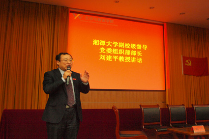 主持人刘丹青开场白之后,刘建平教授发表了重要讲话。刘教授列举了各行业中出自湘大的人才,告诉同学们要重视这样的活动,并呼吁同学们要热爱专业,热爱班级,热爱学院,热爱学校。刘教授还鼓励党员要积极发挥作用,让党旗飘扬,党杯发光。刘教授的讲话很有感染力,场下掌声不断。随后,唐春副书记发表讲话。唐书记首先对刘教授表示感谢,之后给同学们介绍了我们学生党支部的机构设置和特色活动,并对我们13级学生在军训队列中取得二等奖,大合唱取得一等奖表示祝贺和感谢。最后,唐书记祝本次活动取得圆满成功。