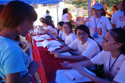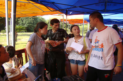 28日早晨六点半,工作人员就赶到俱乐部前坪搭起迎新点帐篷,张贴宣传制品,做好布置工作。工作人员身着统一工作服热情地接待新生和家长,并帮助新生办理各种入学手续。今天虽然并非是男同网