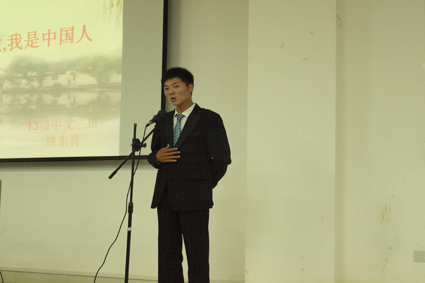 团委学生会学习部精心编排的视频配音《中华诵之甄嬛版》、《中华诵之好声音版》,给全场观众带来欢笑,也点出比赛要注意的各方面事项,以便选手更好发挥。大赛在9位参赛选手的VCR自我介绍中拉开序幕,形式新颖,夺人眼球。随后,参赛选手身着正装依次登台朗诵。第一位登场的是13中文三班的姚东喜同学,一篇《我骄傲我是中国人》把对祖国的浓浓情谊抒发得淋漓尽致。5号来自13广告一班的王方方同学,用饱满的热情朗诵着“中国,中国,英雄的中国”,一篇《中国崛起,中国梦》感染着每一个人。7号来自13广电一班的黄嘉慧同学一身白裙惊艳全场,一篇《中华颂》轻重缓急得当,声情并茂,赢得台下阵阵掌声。