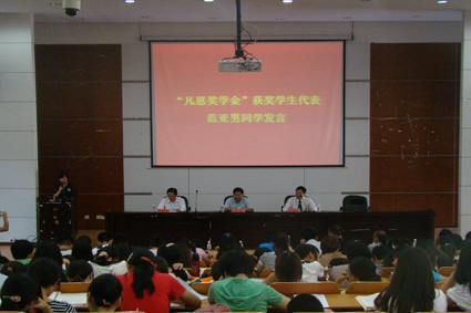 院长季水河教授主持,在庄严的国歌中开始。季水河教授在简单介绍“凡恩奖学金”情况后,宣读了2011-2012年度“凡恩奖学金”颁奖决定,由高源先生、左泽亮先生为获奖同学颁奖。他们分别是:范亚男、张彩云、范伟森、刘立、文衡玉、闫杰、惠荣、郝羚君、张文慧九位同学。