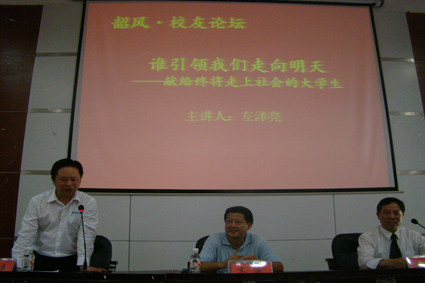 之后,左泽亮先生作了题为《谁引领我们走向明天——献给终将走上社会的大学生》的报告。他首先以一个富有寓意的小故事引入当前严峻的就业形势现状。他提到,大学生就业问题与其抱怨社会,不如改变自己。“大学”两字中,“大”比“学”更重要。大量的学习,广泛汲取各种知识;大胆的学习,勇于创新突破固有模式;大家来学习,老师与同学共同学习,团结合作才是王道。专业、经验、学习、创新,大学生只有如此,才能在严峻的就业形势中找到出路,才能在激烈的行业竞争中立于不败之地。