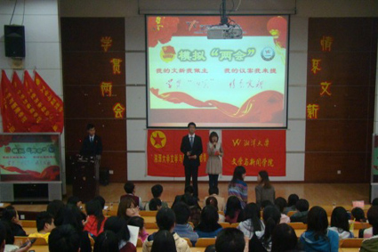 团委学生会组织部承办的“模拟两会”活动在逸夫楼第二报告厅成功举行。担任此次活动评委的有文新院团委学生会主席团成员,到场的嘉宾有上届组织部部长王冰、吴海燕。张家麒和王爽星担任本次活动的主持人。