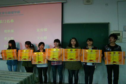 接下来由管胜昔老师宣读表彰决定,颁发优秀干事奖、优秀部长奖、优秀部门奖,对获奖个人与部门进行表彰。