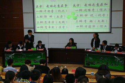 辩论队成员制作的视频,幽默搞笑,却让大家看到了辩论队的温馨有爱。随后,主持人刘弈飞、刘丹青通过一段《爱情公寓》和《功夫熊猫》的视频,引出“武林之意在争”还是“武林之意在和”这一辩题。来自文新院、土力院、信工院、法学院、化工院和化学院的八位辩手依次登台,为大家呈现了一场精彩纷呈的表演赛。
