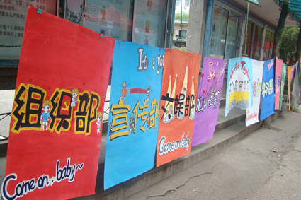 团委学生会有组织部、宣传部、青年志愿者实践部、文心报等14个部门,各部门职责不同、特点相异,可谓是各有千秋。北苑主干道上挂着由广告部手绘的14张海报,五颜六色的海报包容了每个部门的特色,吸引着往来的路人驻足欣赏。新生陆续到男同网