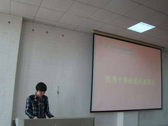 随后,团委书记廖文婷老师宣读了优秀干事、优秀部长以及优秀部门的名单。颁奖过后,获奖干事、部长和部门代表都依次进行发言。获得“优秀部长”称号的公关部部长贾晨阳在发言中细数自己当年竞选部长时做下的承诺以及兑现情况,幽默的语言引来阵阵掌声。
