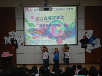 班服展示环节中,各班同学身着班服依次闪亮登场。11广电二班的班服主题为“我的青春我做主”,他们的展示分为“校园风”、“中国风”、“流行风”三部分,将大学生的无限活力展现的淋漓尽致,正如他们所说的“玩的就是创意”。 以妙趣横生的视频“寻找青春”为展示亮点的11广告一班则突出了本次大赛的主题“把青春穿在身上”,他们以“迸发”为主题的班服体现了广告人华丽而不张扬的风采。其他班级也纷纷以舞蹈、新闻播报、发布会等新颖的形式为本次大赛的展示环节写下浓墨重彩的一笔,过程中同学们热情高涨,掌声不断。