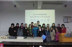 研究生会、团总支组织部部长李朝君主持,分别来自文艺学、语言学及应用语言学、中国古典文献学、中国古代文学、比较文学与世界文学、新闻学和传播学的13组选手参与了角逐。来自10级文艺学的谢菁