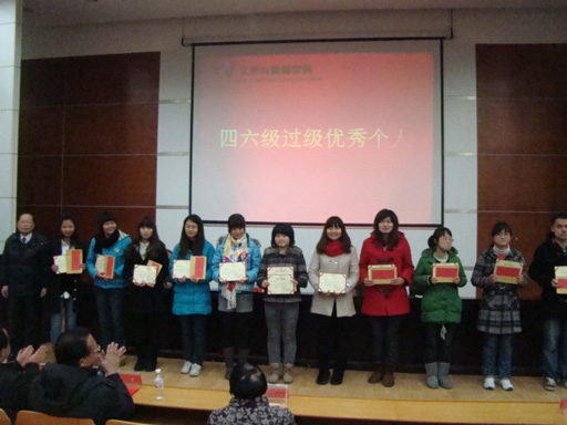 获得科研奖的老师有刘中望和朱军;获得教学奖的老师有何纯、盛新华和孙丰国;获得优秀管理工作者的是李军华老师;获得优秀班主任的是赵成林老师;获得英语四六级过级优秀班集体的有2007级新闻学一班、2008级汉语言文学三班和2009级广播电视新闻学一班;获得英语四六级过级优秀个人的同学有08新闻学一班何辛,09汉语言文学二班赵媛,09新闻学一班张念、刘妍,09新闻学二班彭姣,09广播电视新闻学一班黄艺丹、何蓉、蒋依历,09广告学一班马雨齐、刘鑫,09广告学二班申婉婷。李书记、王院长和雷院长一一为获奖老师和学生颁奖,会场掌声四起,喝彩不断。