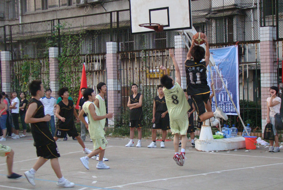 6:53第二节比赛开始。比赛开始4分钟,广告班1号李成一个完美的侧身反手上篮,进了一个二分球,这是广告班自比赛来进的第一个球,广告班的啦啦队尽情呐喊,队员们也信心大增。但新闻班来势迅猛,7:01,新闻11号赵心宇表现突出,反攻,抢篮板,又连进两个三分球! 7:05,第二节比赛结束,新闻班以27:8的比分持续领先。