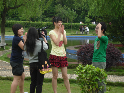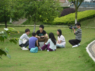 研究生与本科生相聚在泽园。在自我介绍开始之后,50多名学生自由分组,由每个研究生各带领5名学生,进行DV的拍摄。首先研究生的学长学姐们为学弟学妹们演示最基本的摄像机原理和相关操作,并进行简短的示范拍摄,然后选择素材,让学弟学妹体验DV的乐趣,在他们使用的过程中纠正动作,指导拍摄,寓教于乐。同学们一会儿用DV拍摄同学们嬉闹的场景,一会儿拍摄同学们讨论问题的画面,兴致非常浓郁。