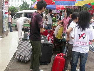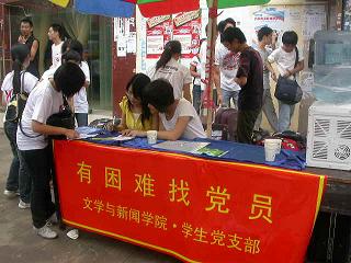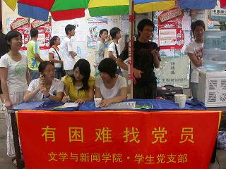 (本网讯)在文新院的迎新工作中,本院学生党员也积极参与其中,为迎新工作贡献自己的力量。 党员义务岗设在北苑男生宿舍门口,大大的红色喷绘“有困难,找党员”六个字特别醒目。党员义务岗的值班人员主要是刚步入大二的各班的党员和部分入党积极分子,他们的工作主要是为新生解答疑惑和接待从南苑行李站运过来的学生行李,并帮忙将其运到学生宿舍。同时,义务岗的成员积极配合迎新总站的工作,机动的插入到人手不够的岗位中,充分体现了男同网 党员的良好的思想风貌。