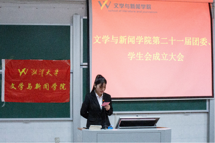 龚鑫老师致开场辞,感谢历届团委、学生会付出的同时也向第二十一届团委、学生会的成立表示祝贺。“新学期、新起点、新梦想”,希望全体成员能够以成立大会的举办为契机,了解我们组织的光辉过往、发展现状,利用好平台优势、品牌优势取得更大的成就。