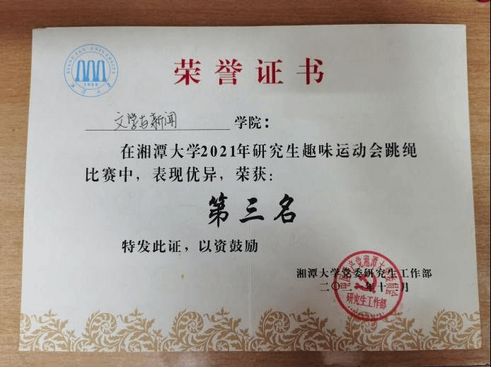 选手不负众望在“跳大绳”比赛中收获了第三名的好成绩。本次活动让全体研究生在紧张的学习工作之余也锻炼了身体,在轻松愉悦的氛围中培养了团队精神,收获了友谊和健康的身体;这样的意义已经远胜于输赢本身。
