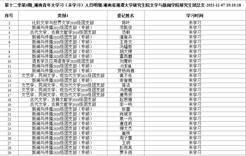 青年大学习第十二季第6期学习已截止,截止时间为11月7日晚七点。现将未学习名单公布如下。请各团支部书记今后务必认真督促团支部成员,落实每周青年大学习的完成。