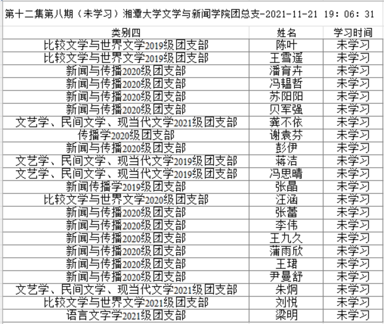 青年大学习第十二季第8期学习已截止,截止时间为11月21日晚七点。现将未学习名单公布如下。请各团支部书记今后务必认真督促团支部成员,落实每周青年大学习的完成。