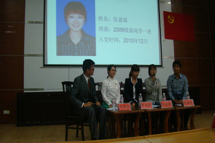 汉语言文学、新闻学、广告学与广播电视新闻学四个专业的09级优秀党员嘉宾雷亚男、伍嘉瑶、申婉婷和何奕桦上台就坐。随后,在嘉宾访谈环节,他们就学习、社团活动、实习及入党等方面与现场同学分享了自己的经验与心得。