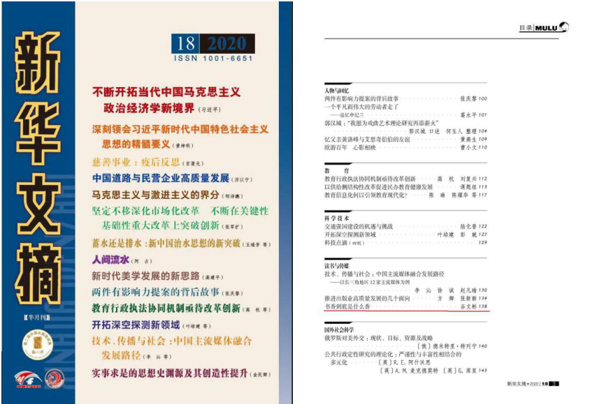 青年教师谷文彬博士的论文《书香到底是什么香》(原载《光明日报》2020年6月26日《书香到底是什么香》)被国家权威转载刊物、校定一类期刊《新华文摘》全文转载(2020年第18期)。