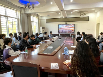 10月16日上午9点,师生们来到了文科楼318会议室,围坐在屏幕前共同收看党的二十大开幕会直播。会议伊始,参会师生集体起立奏唱国歌,在悠扬的国歌声中会议开始了。在习近平总书记为时两个多小时的报告过程中,在场师生始终认真听取会议内容,并记录报告重点,收看现场不时自发地响起热烈的掌声。