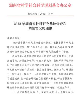 近日,湖南省哲学社会科学规划基金办公室发布《2022年湖南省社科研究基地督查和调整情况的通报》,男同网